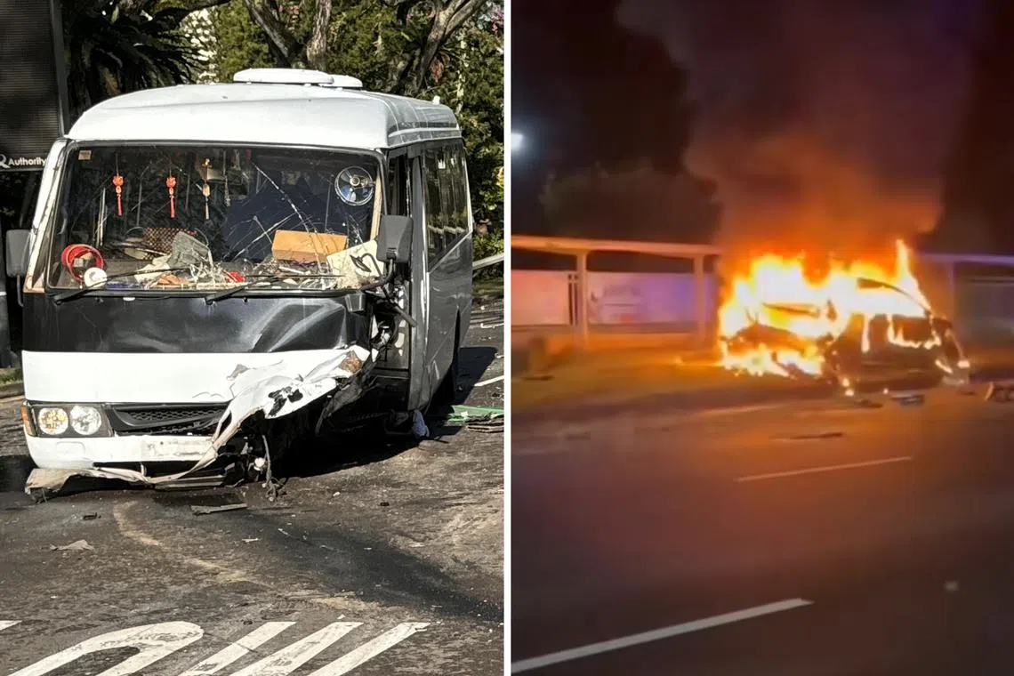 Kereta itu terbakar selepas pelanggaran tersebut. Kebakaran itu dipadamkan pegawai Pasukan Pertahanan Awam Singapura (SCDF) menggunakan jet air.