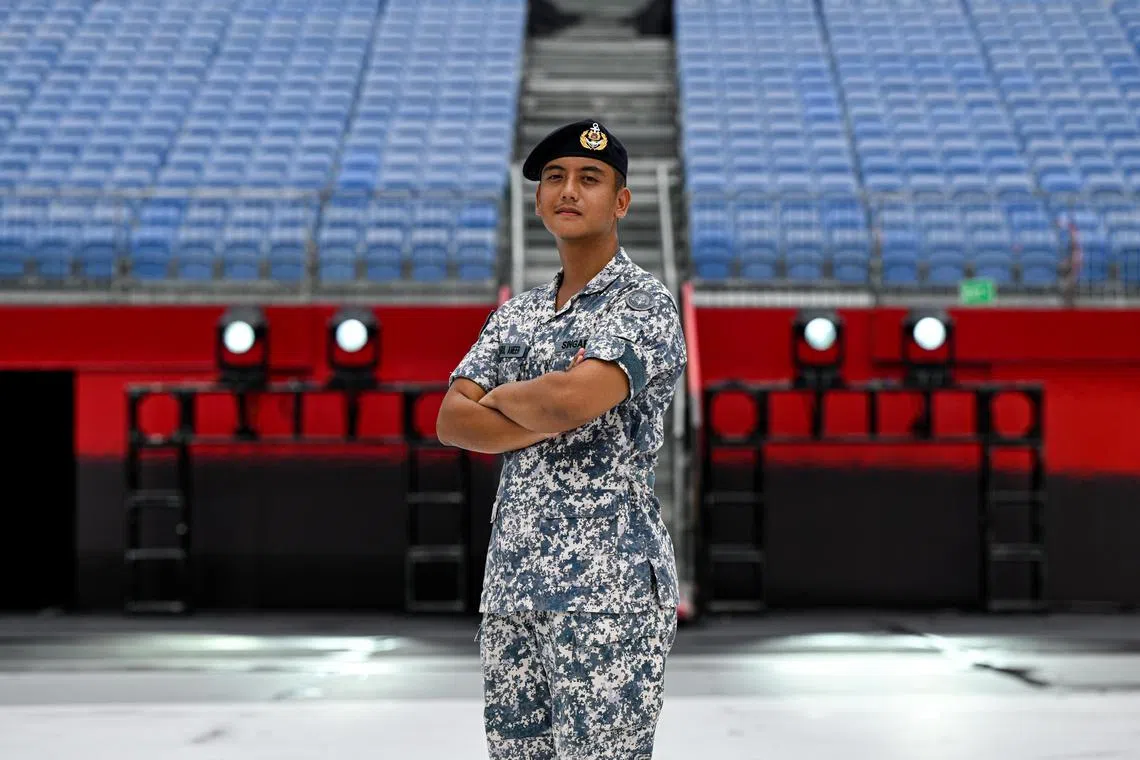 Kadet Spesialis (SCT) Md Khairul Ameer merupakan salah seorang daripada peserta segmen Perbarisan dan Upacara (P&C) bagi Perbarisan Hari Kebangsaan (NDP) 2024 yang berbaris dalam kontinjen Angkatan Laut Republik Singapura (RSN). - Foto BH oleh SHAFIQ APANDI