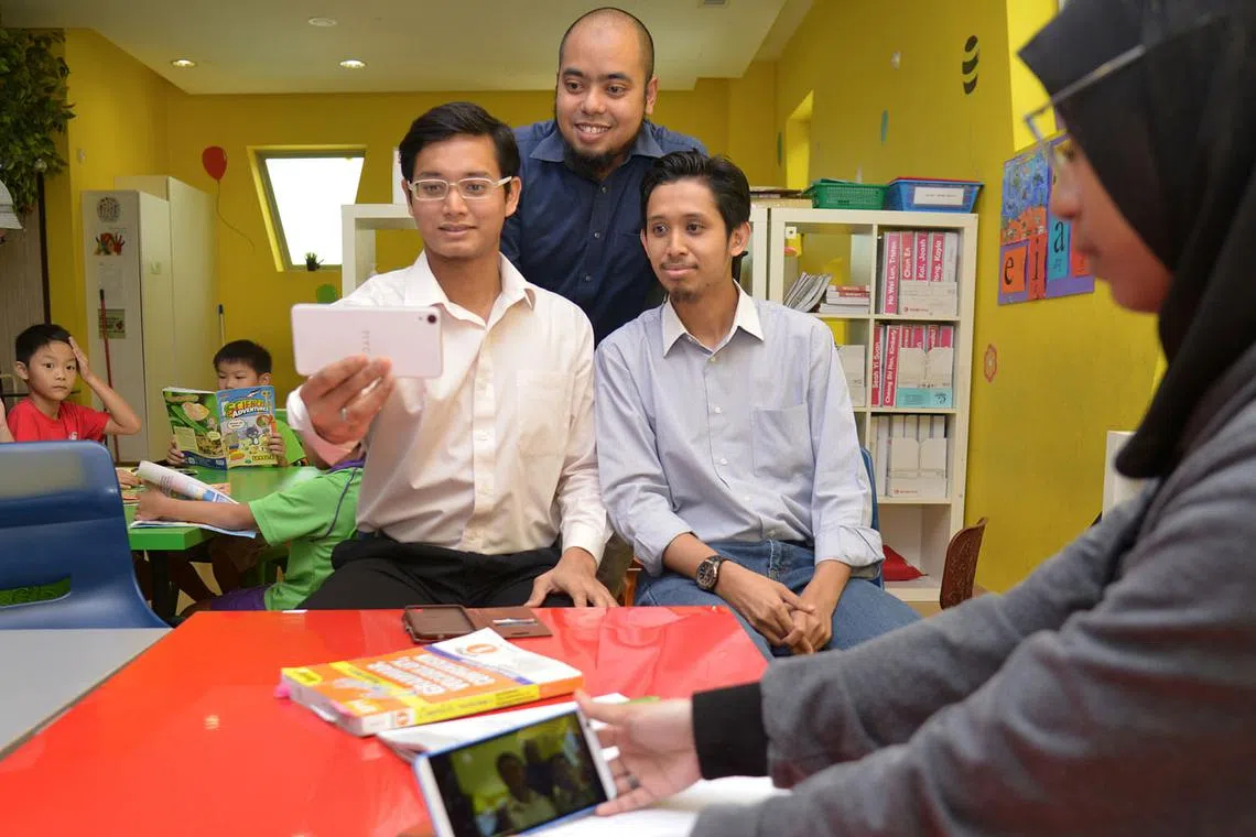 TEROKA DIGITAL: (Dari kanan) Encik Muhammad Mohamed Rahim, Encik Salihin Mohamed Rahim dan Encik Muhammad Taufik Yahya (berdiri) merancang meluaskan aplikasi mereka ke pasaran serantau. Buat masa ini, aplikasi itu sudah menarik perhatian pengguna dari Indonesia. - Foto fail -