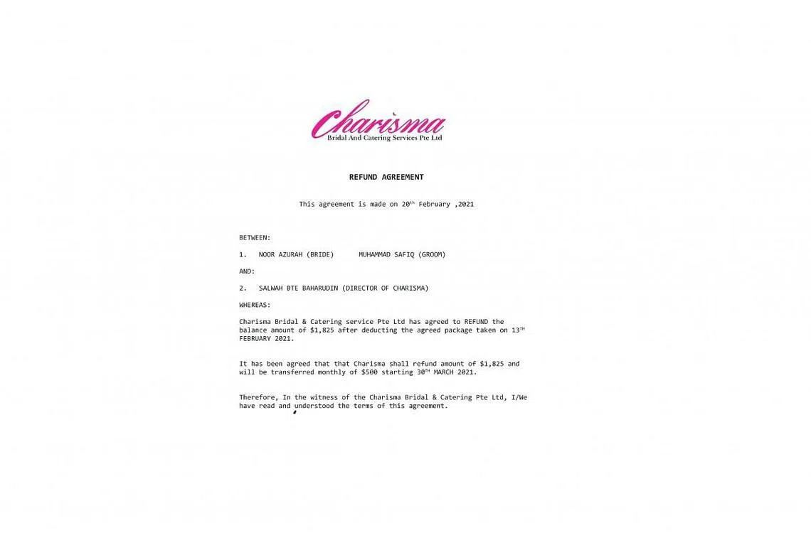 Beberapa pelanggan memberitahu Berita Harian (BH) pengarah Charisma, Cik Salwah Baharudin, telah memberikan mereka persetujuan bertulis untuk memulangkan sebahagian wang yang dibayar secara ansuran apabila majlis mereka dikecilkan.