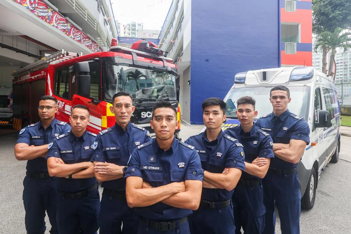 OPERASI BERJAYA: (Dari kiri) 3SG, Rafiqi Hilman; Staf Sarjan Ahmed Haliim Khan; Pegawai Waran 2 (WO2), Muhammad Himmi Ibrahim; komandar balai bomba, Mejar Othman Sharif; Leftenan Teo Kang Xiang; Korporal NSF Aaron Tay Hong Jun; 1SG NSF Christopher Kai Treloar. Mereka terbabit dalam operasi menyelamat dan memadamkan kebakaran di satu flat di Sengkang pada Rabu. - Foto ZAOBAO
