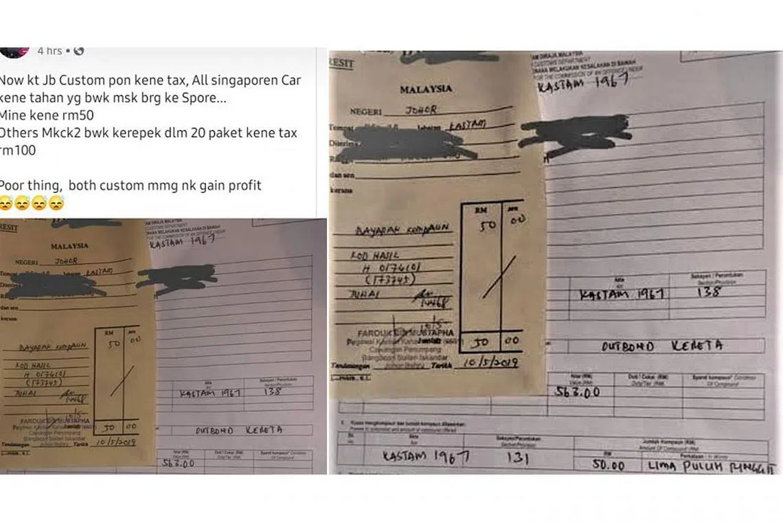 SALAH FAHAM: (Gambar kiri) Kiriman media sosial Cik Ayda Suet yang ditularkan di laman Facebook memberi gambaran seolah-olah Kastam Johor mengenakan cukai ke atas barangan yang dibawa pemandu dan penumpang kereta ketika melintasi Koswe Johor sedangkan resit rasmi (gambar kanan) menunjukkan kompaun dikenakan ke atas beliau kerana gagal mengisytiharkan barang dagangan - lima kotak kertas dinding yang dibawanya. Jabatan Kastam Diraja Malaysia menyatakan Cik Ayda dikenakan kompaun RM50 ($16.50). - Foto FACEBOOK AYDA SUET dan SAINI SALLEH -