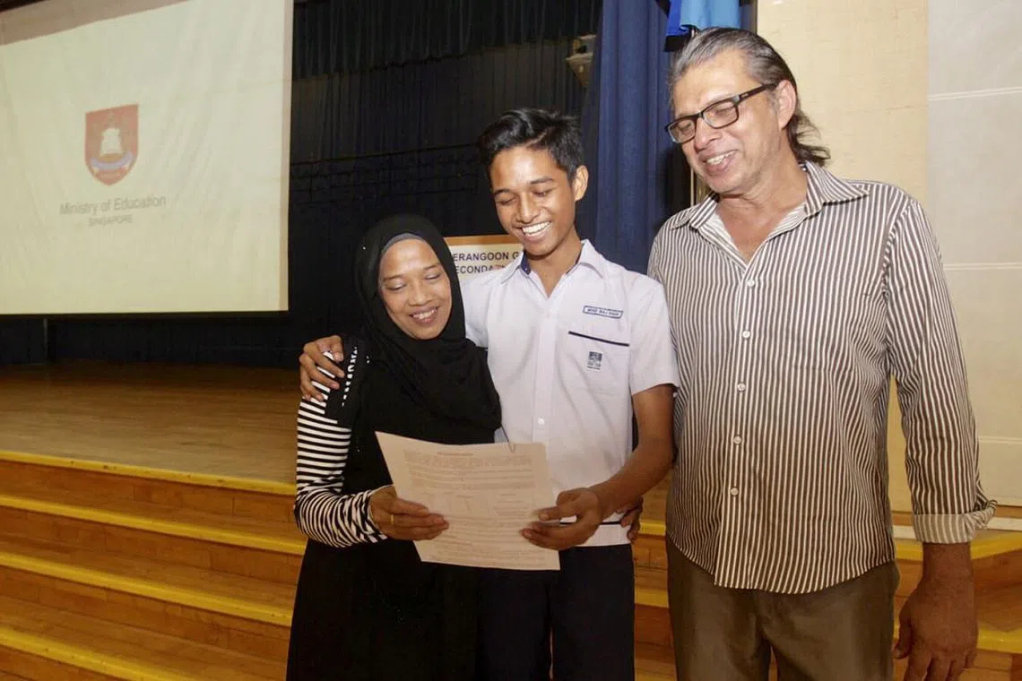 TERSENYUM LEBAR: Iraj (tengah), yang menerima keputusan GCE peringkat 'O' di Sekolah Menengah Serangoon Garden, berjaya meraih keputusan memuaskan membanggakan ibunya, Cik Maskana Jaffar, 55 tahun, serta bapanya, Encik Mohammed Ashfaq Khan, 59 tahun. - Foto BH oleh IQBAL FAIZAL -