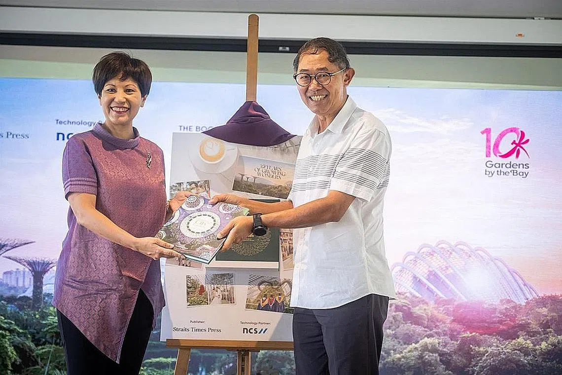 RAI ULANG TAHUN KE-10: Menteri di Pejabat Perdana Menteri merangkap Menteri Kedua (Kewangan dan Pembangunan Negara), Cik Indranee Rajah dan Pengurusi Gardens By The Bay, Encik Bay Niam Chiang Meng, melancarkan buku sempena ulang tahun ke-10 Gardens By The Bay bertajuk Blossoming City Garden.