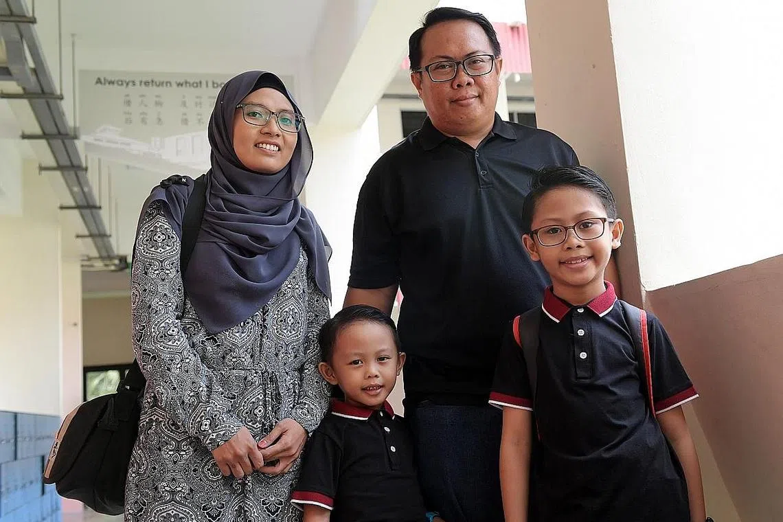 RINGANKAN BEBAN: Encik Mohd Hijazi Masderbari dan isteri, Cik Noor Susilawati Mohd Sanosi, lega dengan bantuan baucar Skim Bantuan Sekolah, Dana Amanah Pendidikan (ETF), yang diterima anak bongsu mereka, Muhd Rizq Wildan (hadapan kiri). Bersama mereka anak sulung, Rifqi. - Foto BM oleh ALPHONSUS CHERN -