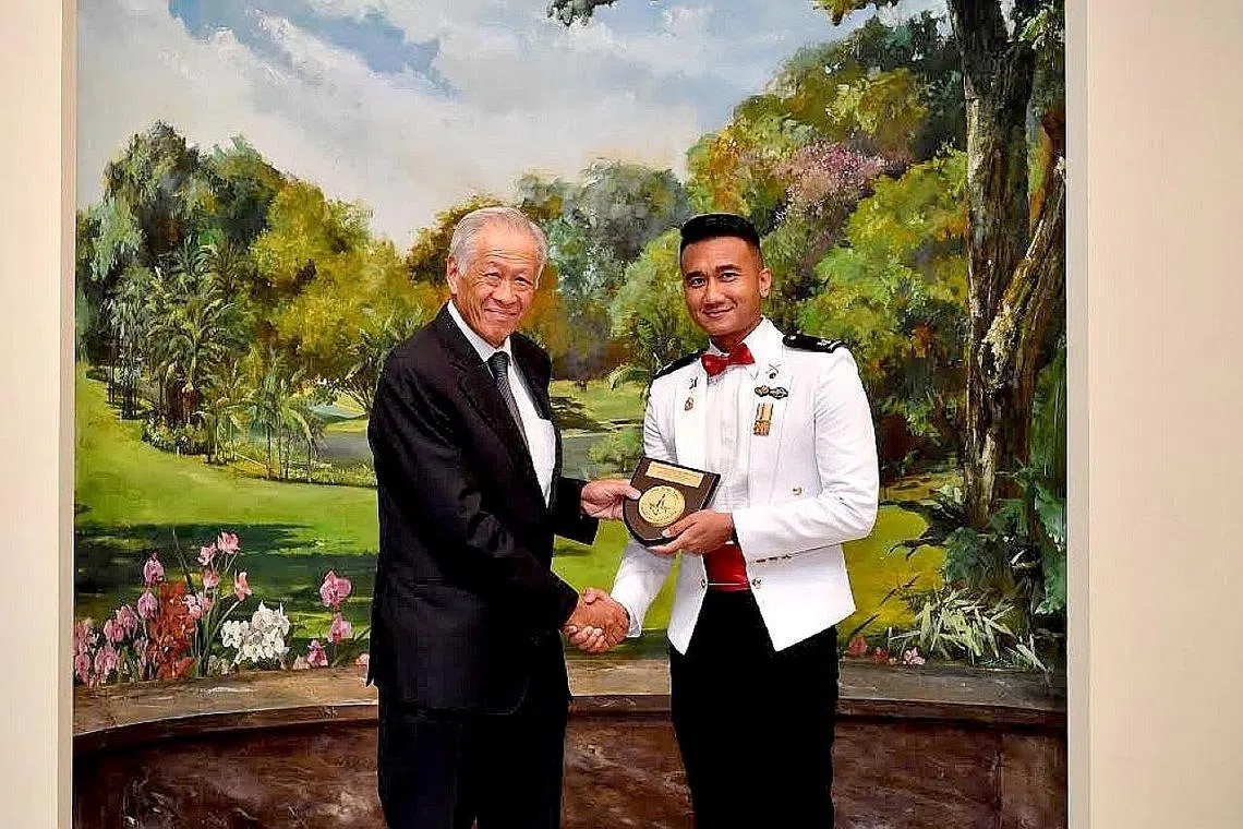 Kelmarin, Mejar Mohamed Firdaus, 35 tahun, menerima anugerah atas pencapaiannya daripada Menteri Pertahanan, Dr Ng Eng Hen, sewaktu majlis makan malam yang diadakan di Istana.