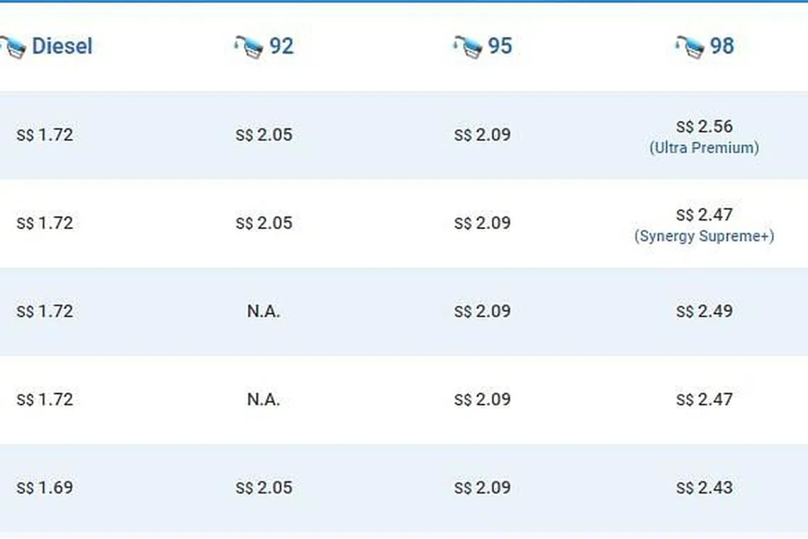 Pemeriksaan Berita Harian di laman Fuel Kaki, gerbang Persatuan Pengguna Singapura (Case) yang memantau harga minyak di sini, menunjukkan seliter minyak oktane-92 dijual pada harga $2.05 manakala minyak oktane-95 dijual pada harga $2.09 bagi kesemua jenama.