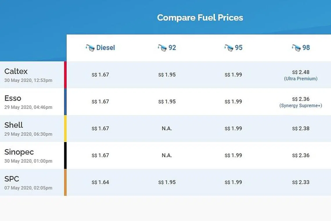 Petrol 92 dan 95 oktane mereka kini masing-masing bernilai $1.95 dan $1.99 seliter sebelum diskaun, menurut Fuel Kaki, pihak yang memantau harga minyak kenderaan yang diuruskan Persatuan Pengguna Singapura (Case).