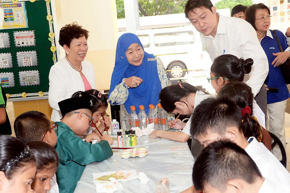 SENI MENYATUKAN MEREKA: (Dari kiri), Pengetua Sekolah Fernvale Gardens, Cik Chan Kwai Foong; Puan Noor Aishah Mohd Salim; dan Menteri Negara (Kesihatan), Dr Lam Pin Min, menyaksikan pelajar arus utama daripada Sekolah Rendah Fernvale menjalankan kegiatan seni bersama pelajar kurang upaya intelek daripada Sekolah Fernvale Gardens sempena sambutan Hari Sindrom Down Sedunia semalam. - Foto JOHARI RAHMAT -