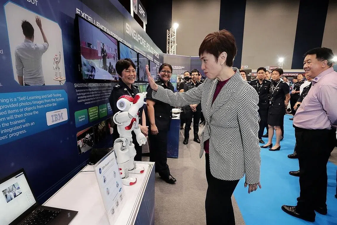TINJAU TEKNOLOGI BARU: Cik Teo meninjau robot yang menggunakan teknologi PowerAI Vision di pameran Pasukan Polis Singapura (SPF) semasa menghadiri Seminar Pelan Kerja Home Team. - Foto BH oleh KELVIN CHNG -
