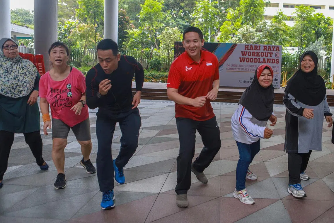SENAMAN LEBARAN: HPB menganjurkan siri sesi senaman 'Hari Raya Workout' untuk menggalak masyarakat Melayu bersenam semasa musim Lebaran. Encik Amrin Amin (empat dari kiri) menyertai sesi pertama itu yang diadakan di Kampong Admiralty semalam. - Foto BH oleh IQBAL FAIZAL -