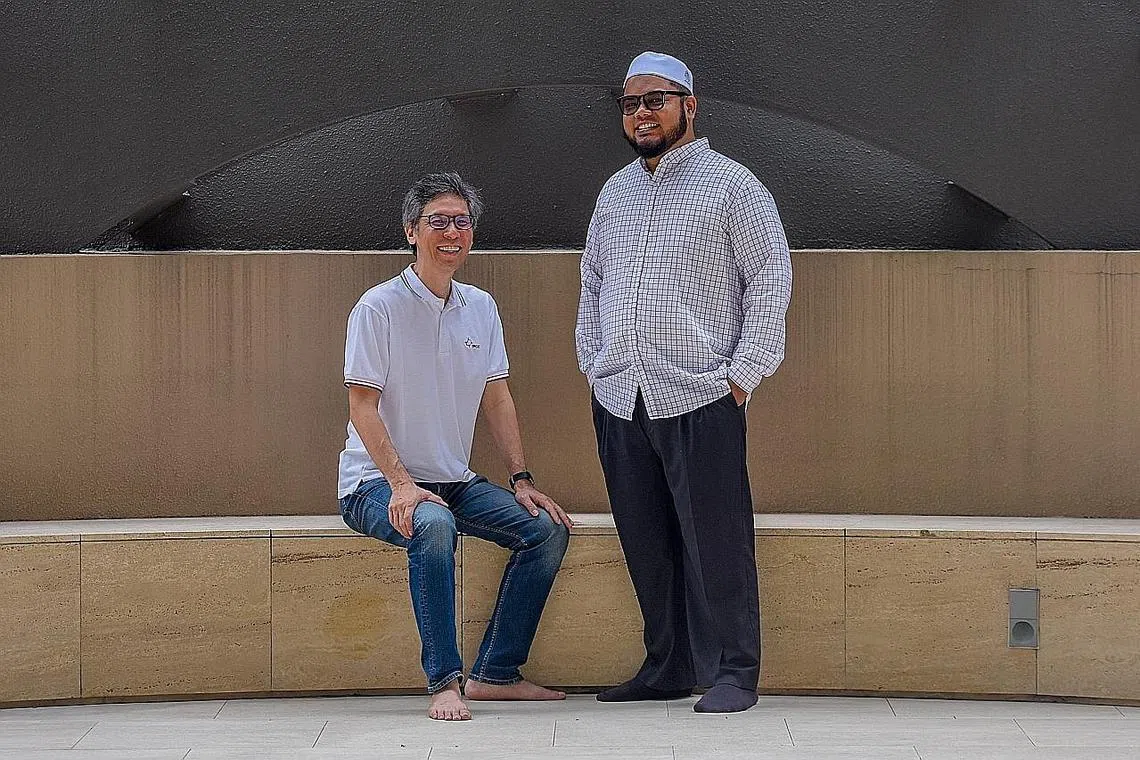 PERKUKUH HUBUNGAN MASYARAKAT: Pengerusi Kumpulan Keyakinan Antara Kaum dan Agama (IRCC) Punggol West, Encik Jonathan Tow (kiri), bekerja rapat dengan badan-badan agama di kawasan Punggol West, termasuk bersama Ketua Dakwah dan Pembangunan Masyarakat di Masjid Al-Islah, Ustaz Khairul Anwar Mohamed Aznan (kanan), untuk mengadakan kegiatan dan program silang kaum dan agama demi memperkukuh keharmonian dalam masyarakat. - Foto BM oleh SYAZA NISRINA -