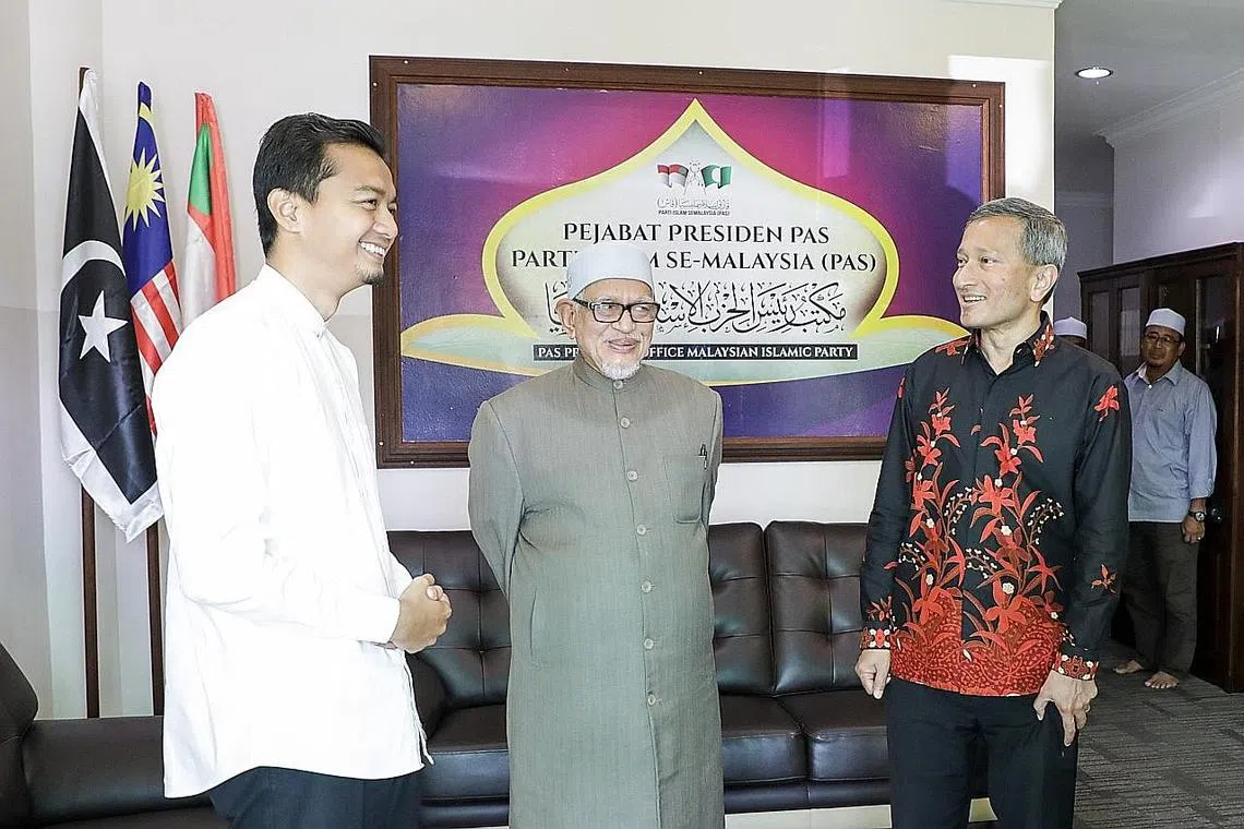 PERERAT HUBUNGAN: Dr Balakrishnan bertemu dengan presiden PAS, Encik Abdul Hadi Awang, semasa berada di Kuala Terengganu. Kata Dr Balakrishnan, adalah penting bagi Singapura dan PAS saling mengenali satu sama lain. - Foto MFA -
