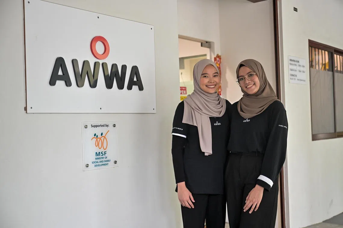 Pekerja sosial AWWA, Cik Nur Atikah Hamdan (kiri) dan Cik Siti Syuhada Shahbudin (kanan) merupakan rakan sekelas ketika kecil dan mengikuti pendidikan agama. Mereka bertemu semula di AWWA dan kini menyokong satu sama lain dalam tugasan seharian mereka. - Foto BH oleh SHAFIQ APANDI