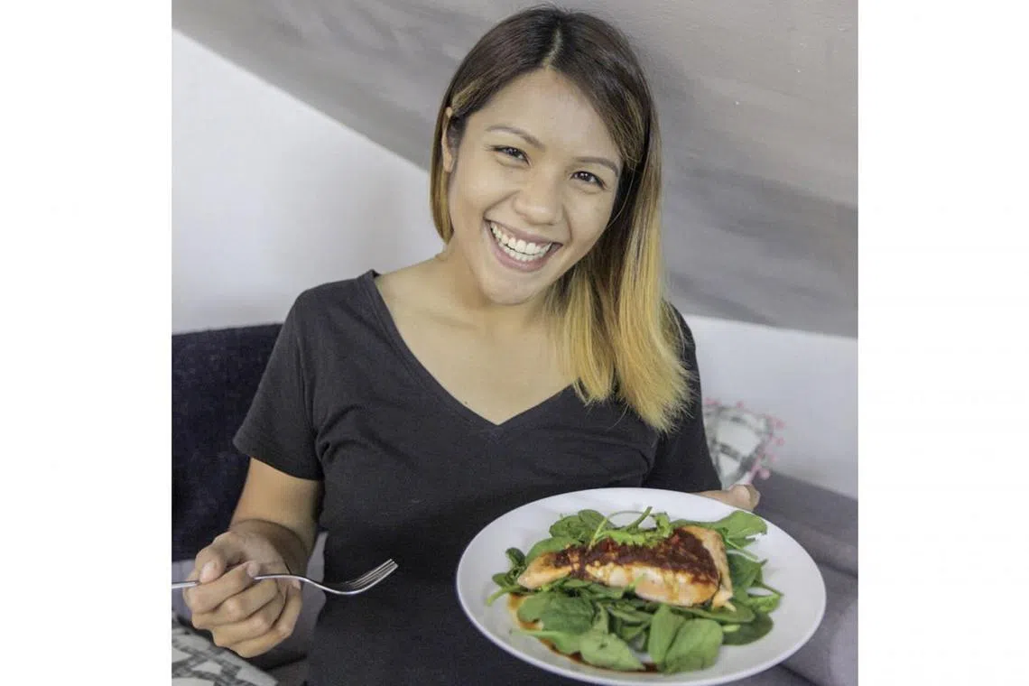 PELBAGAI KHASIAT: Ikan salmon, terutama jenis yang liar, mengandungi banyak khasiat dan sesuai dimasak dalam pelbagai jenis lauk. Cik Aqilah Norazman menunjukkan hidangan 'Sambal Ikan Salmon dan Bayam Muda' yang dihasilkannya. - Foto BH oleh IQBAL FAIZAL -