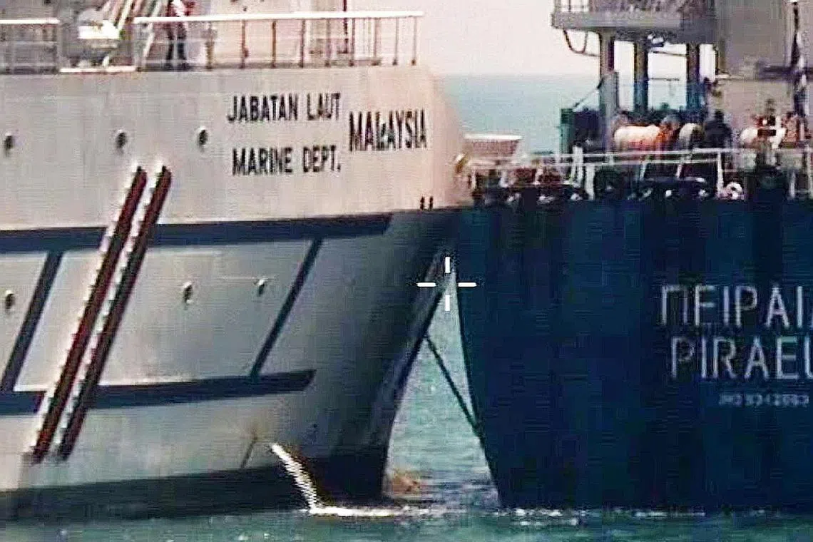 BERLANGGAR: Kesilapan kapal Pireas (kanan) semasa membelok menyebabkan pelanggaran dengan kapal Polaris yang ketika itu sedang berlabuh di kawasan yang tidak diperuntukkan sebagai kawasan berlabuh dalam kawasan had pelabuhan Singapura. - Foto fail -