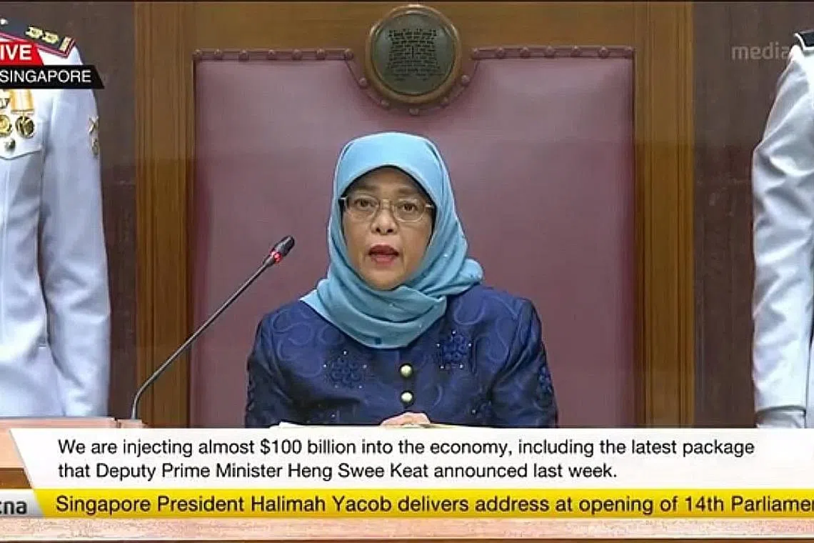 PENGGAL BARU PEMERINTAH: Presiden Halimah Yacob menyampaikan ucapan yang membentangkan keutamaan dan dasar pemerintah bagi penggal baru. - Foto GOV.SG -