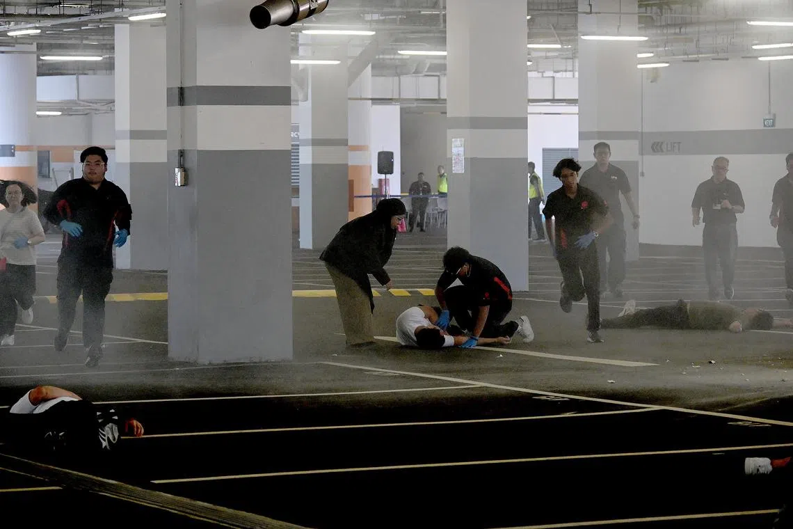 Latihan itu melibatkan sekurang-kurangnya 40 peserta, terdiri daripada pegawai SPF, SCDF, pelajar dan lima sukarelawan Kelab Lionhearters.