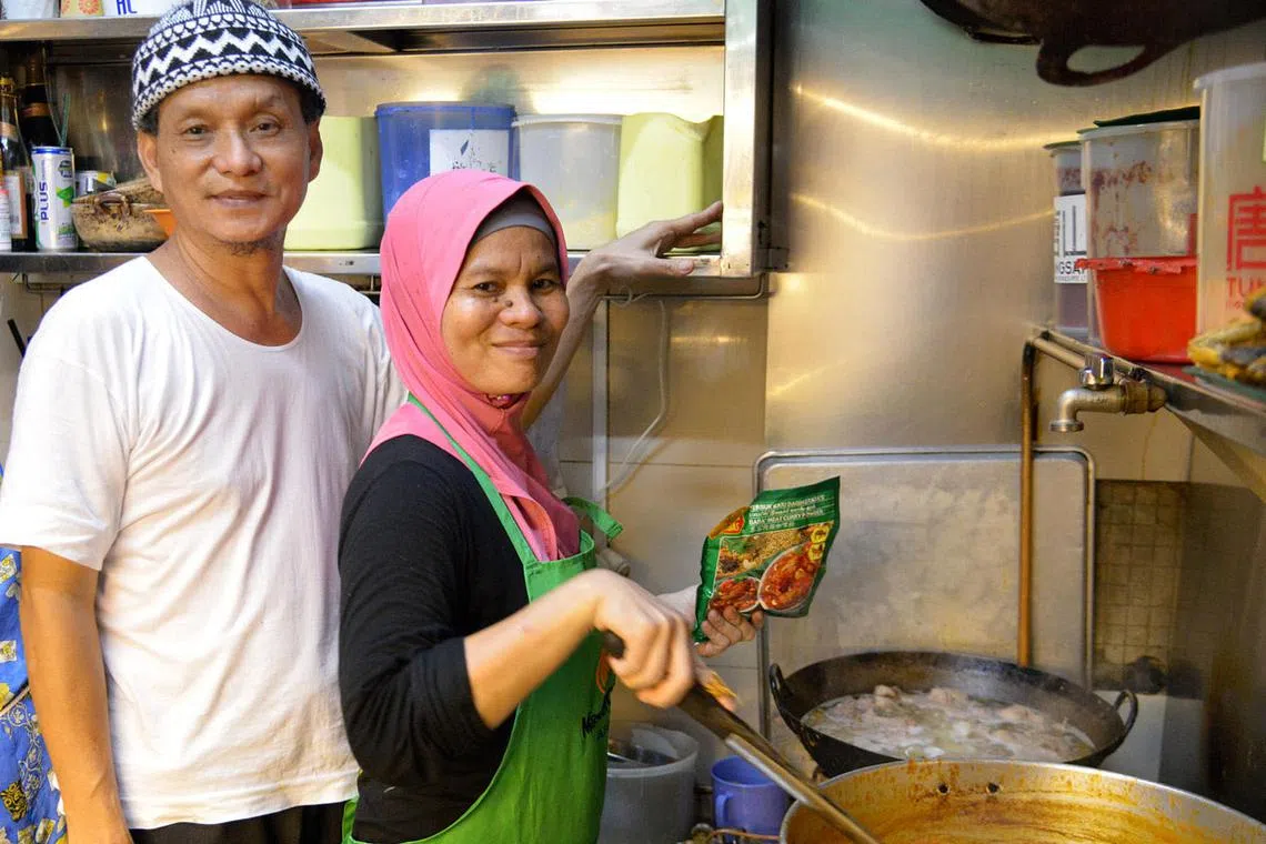 BERUSAHA BERI LAYANAN BERMUTU KEPADA PELANGGAN: Pemilik gerai Hajah Monah Kitchen, Encik Rosli Ahmad, bersama adiknya yang juga merupakan tukang masak, Cik Rohani Ahmad. - Foto SHAKIR SAIFUDDIN -