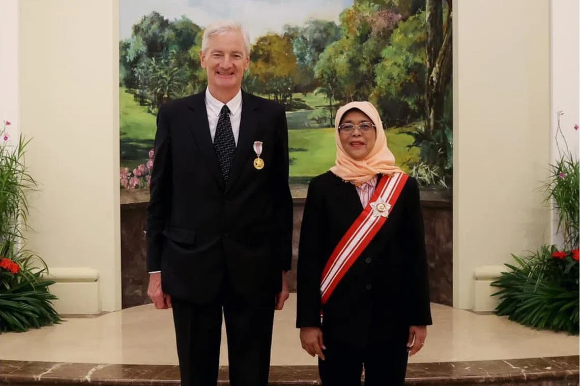 Usahawan Britain berusia 76 tahun itu menerima anugerah tersebut daripada Presiden Halimah Yacob dalam satu majlis di Istana.