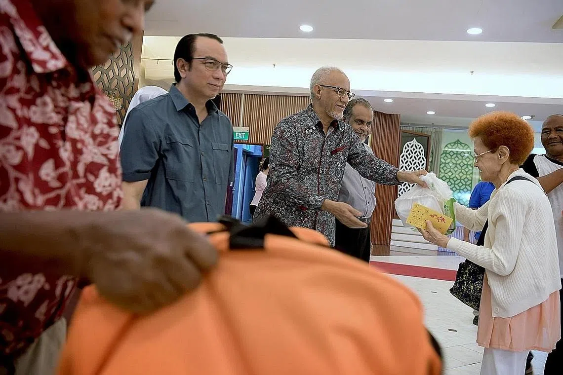 AGIH BANTUAN: Encik Mohamed Abdullah Alhabshee (tiga dari kiri), yang merupakan suami Presiden Halimah Yacob, mengagihkan barang makanan kepada penerima bantuan Jamiyah Singapura pada hujung minggu lalu. Beliau turut disertai presiden Jamiyah, Dr Mohd Hasbi Abu Bakar (dua dari kiri). - Foto BH oleh NG SOR LUAN -