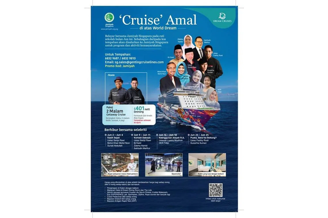 "Dalam masa yang terdekat ini, Dream Cruises akan menampilkan pelayaran istimewa sempena Ramadan dan Hari Raya. Selain itu, Jamiyah juga menganjurkan empat pelayaran khas selama 3 hari 2 malam di kapal persiaran World Dream semasa cuti sekolah bulan Jun akan datang.