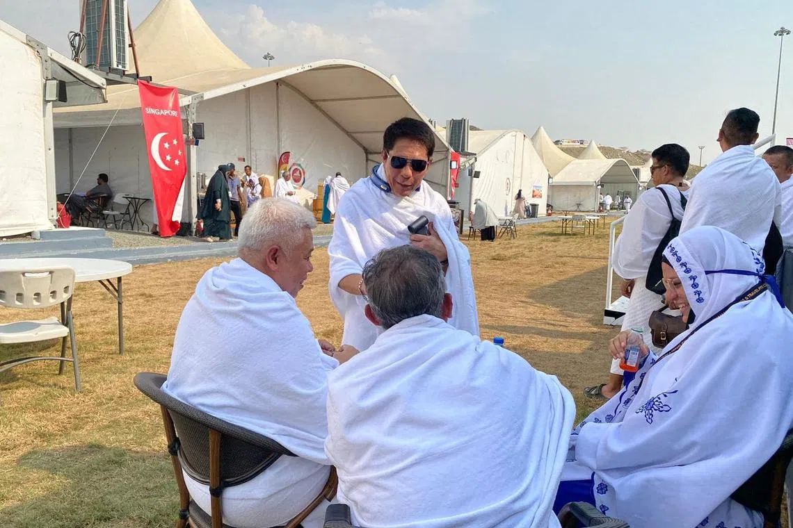 Ketua Delegasi Haji Singapura 2024, Dr Mohamad Maliki Osman (dua dari kiri) kelihatan mendinginkan seorang anggota jemaah dengan menggunakan kipas elektrik. - Foto ERWIN YUHANIS