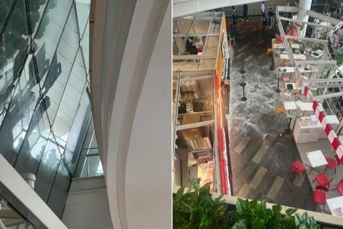 Dalam gambar-gambar yang dikongsi dengan The Straits Times (ST) oleh pengunjung pusat beli-belah itu, kaca tingkap itu kelihatan jatuh daripada tingkat tiga pusat membeli-belah berkenaan.