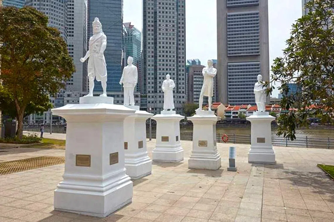 MENGENANG SANG PERINTIS: Lima patung yang menggambarkan Sang Nila Utama, Tan Tock Seng, Munshi Abdullah, Naraina Pillai dan Sir Thomas Stamford Raffles dipamerkan di ruang berhampiran The Arts House dan bersebelahan Sungai Singapura. - FOTO: SINGAPORE BICENTENNIAL OFFICE -
