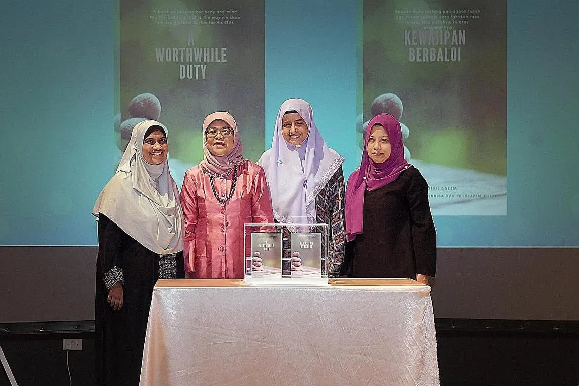 PANDUAN KESIHATAN: (Dari kiri) Setiausaha Kehormat Kelab Heal, Cik Noorunnisa PK Ibrahim Kutty, Presiden Halimah Yacob, Presiden Kelab Heal, Dr Radiah Salim, dan Ketua Pegawai Eksekutif Kelab Heal, Cik Maznah Masop, melancarkan buku Kewajipan Berbaloi di Wisma Geylang Serai kelmarin. - Foto BH oleh ALPHONSUS CHERN -