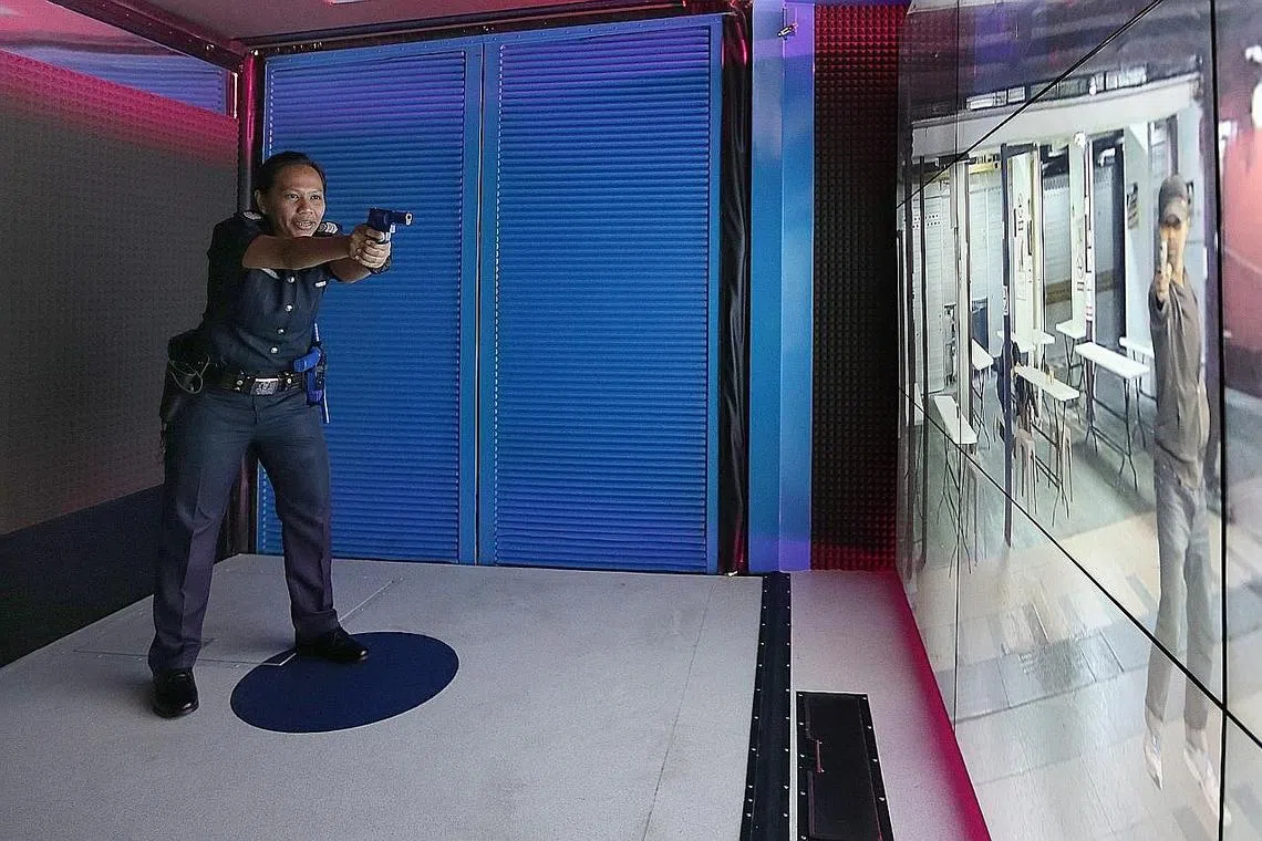 BILIK DARJAH BERGERAK: SSSgt Faridah menunjukkan antara latihan senario yang boleh diikuti pegawai NPC dengan MobiC yang menggunakan teknologi realiti maya atau VR. - Foto ZAOBAO -