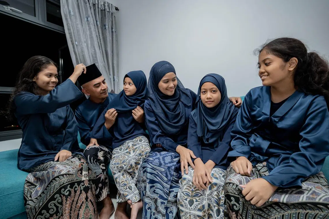 Ini merupakan kali pertama Encik Mohammad Azim Abdul Aziz (dua dari kiri) sekeluarga menyambut Hari Raya Aidilfitiri di flat HDB empat bilik Bina Ikut Tempahan (BTO) sendiri di Sengkang East. Encik Azim diapit anak-anak dan isteri (dari kiri) Ariana, Amira, Cik Nurhaileen Manje, Aurora dan Adriana. - Foto BH oleh NUR DIYANA TAHA