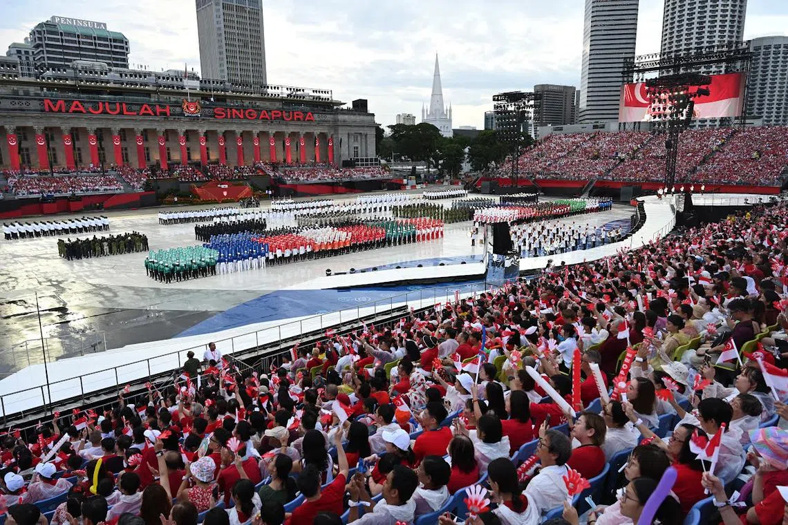 Sebahagian kontinjen NDP 2024 dalam segmen Perbarisan & Upacara (P&C) berarak naik ke kawasan penonton agar penonton dapat melihat peserta kontinjen dengan lebih dekat. - Foto BH oleh SHAFIQ APANDI