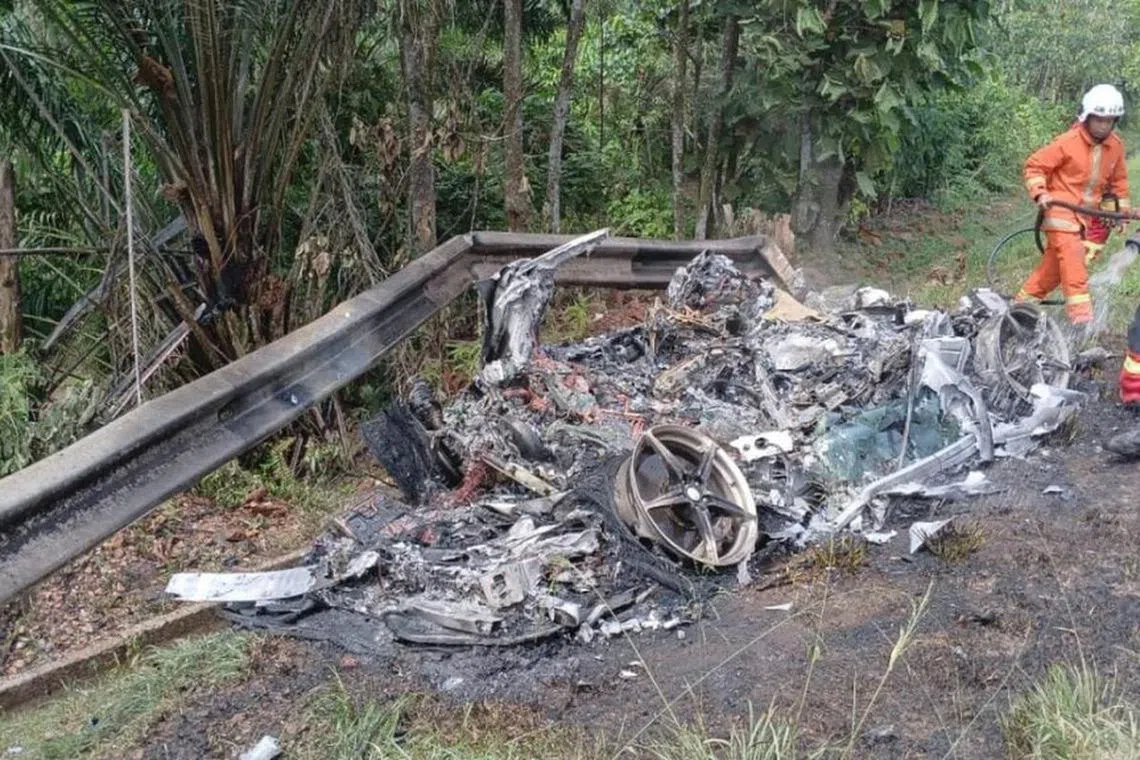 Kereta Ferrari berdaftar S’pura rempuh, terbakar di M’sia