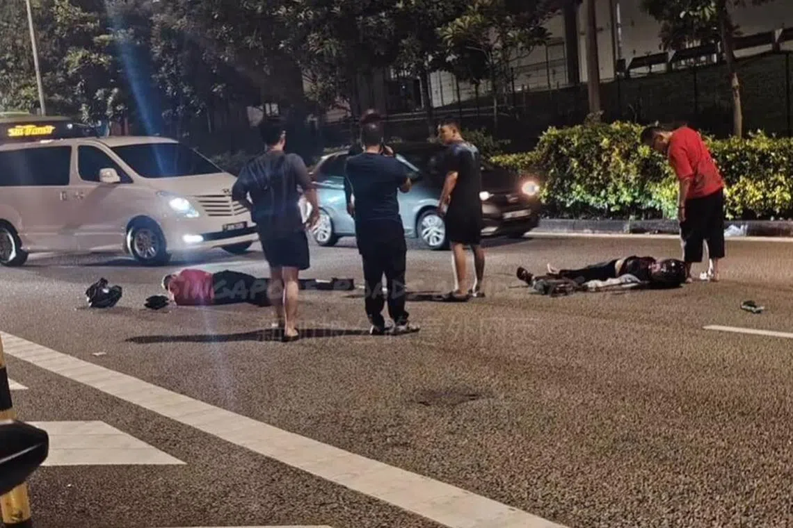 Mangsa kedua boleh dilihat masih memakai topi keledar, terbaring di jalan raya sementara pengguna jalan raya lain cuba menghulurkan bantuan.