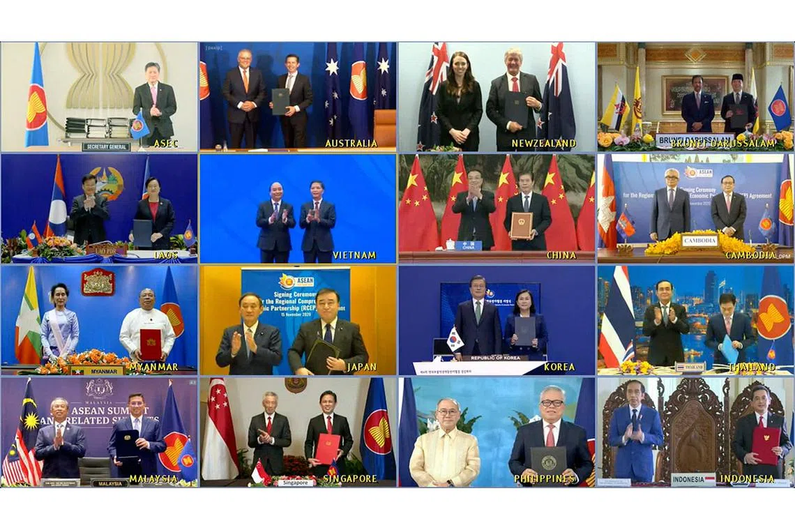 MAJLIS METERAI RCEP: PM Lee Hsien Loong dan Encik Chan Chun Sing (barisan bawah, dua dari kiri) bersama para pemimpinn negara anggota RCEP dirakam menghadiri majlis tanda tangan secara dalam talian di Sidang Puncak Asean semalam. - Foto MCI -