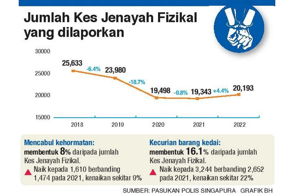 Perangkaan tersebut, yang dikongsi Pasukan Polis Singapura (SPF) dalam sidang media bagi laporan Taklimat Jenayah Tahunan di kompleks New Phoenix Park pada Khamis, menyaksikan peningkatan kepada 1,610 kes berbanding 1,474 kes pada 2021.
