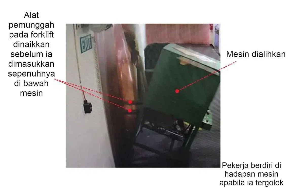 Dalam satu peringatan yang dikeluarkan kelmarin, Majlis Keselamatan dan Kesihatan di Tempat Kerja (WSH) berkata pekerja itu sedang memberi panduan bagi forklift tersebut ditempatkan di bawah mesin itu apabila kemalangan berlaku.
