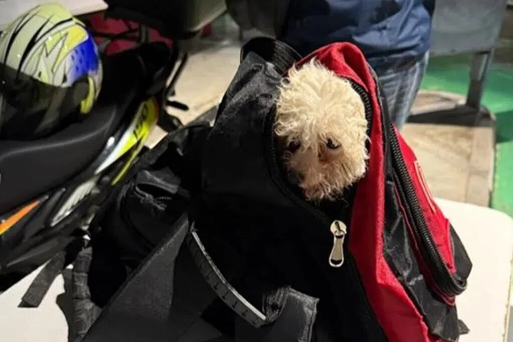Anak anjing tersebut disembunyikan di dalam beg galas dan diletakkan di ruang simpanan belakang motosikal lelaki tersebut.