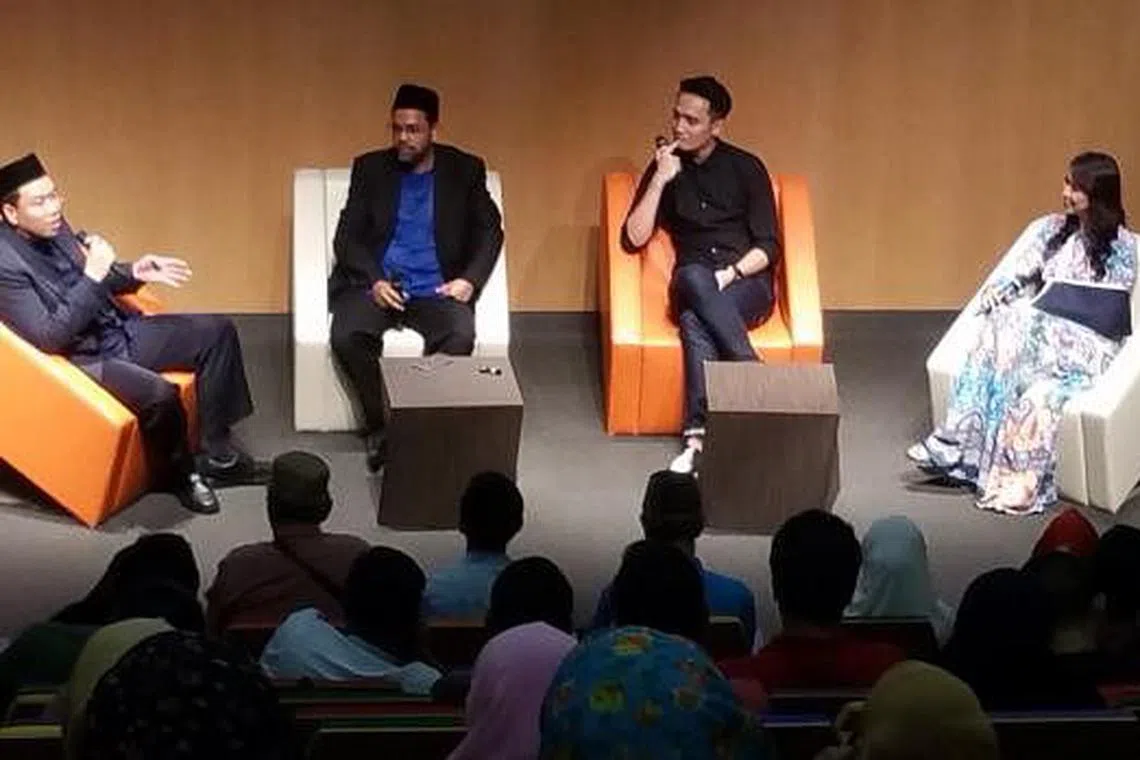 KUPAS ISU MENTUA-MENANTU: (Dari kiri) Ustaz Firdaus dan Ustaz Syed Mustafa menganjurkan seminar mengupas topik mentua dan menantu yang turut mengundang selebriti Fauzie Laily dan Nurul Aini bagi mengongsi pengalaman mereka di Institut Pembelajaran Sepanjang Hayat dekat Paya Lebar baru-baru ini. - Foto NUR ADILAH MAHBOB -