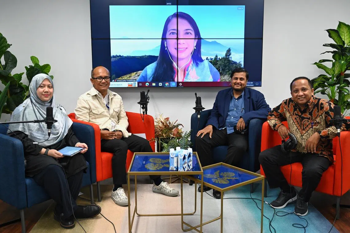 Sesi podcast Berita Harian menjelang pilihan raya Indonesia dihos bersama oleh (dari kiri) Timbalan Editor Berita, Cik Nur Adilah Mahbob dan Editor Bersekutu, Encik Mohd Nizam Ismail, bersama-sama panel penganalisis Ehwal Antarabangsa di Solaris Strategies Singapore, Dr Mustafa Izzuddin; Dr Pradana Boy Zulian, Ketua Pusat Pengajian Islam dan Falsafah Universiti Muhammadiyah di Malang, Indonesia, dan Koresponden Berita Harian di Jakarta, Cik Ismira Lutfia Tisnadibrata yang menyertai podcast menerusi Zoom (kaca tv). - Foto-foto BH oleh KHALID BABA