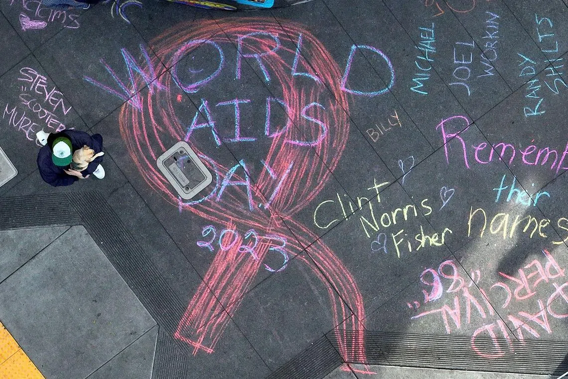 PERINGATI MANGSA: Nama mangsa Aids ditulis dalam tulisan kapur di Castro Street di San Francisco, California, sempena Hari Aids Sedunia yang disambut setiap 1 Disember sejak 1988 untuk meningkatkan kesedaran tentang wabak Aids yang disebabkan oleh penyebaran jangkitan HIV. - Foto AFP