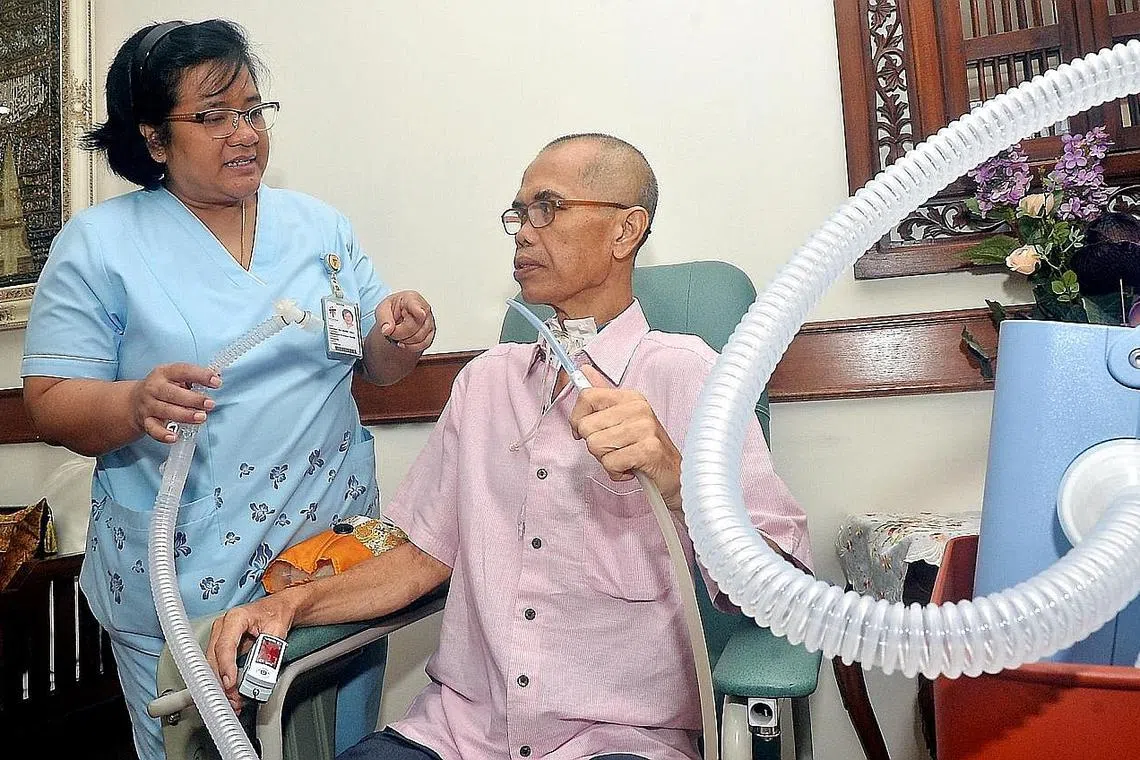 SOKONGAN JURURAWAT: Encik Sahari Musa mendapat sokongan jururawat amali lanjutan atau 'advanced practice nurse' (APN) Hospital Tan Tock Seng, Cik Kamilah Sheikh Jabin, yang datang ke rumah beliau untuk memantau keadaan kesihatannya, selain memastikan mesin penyokong pernafasan beliau dalam keadaan baik. - Foto KHALID BABA -