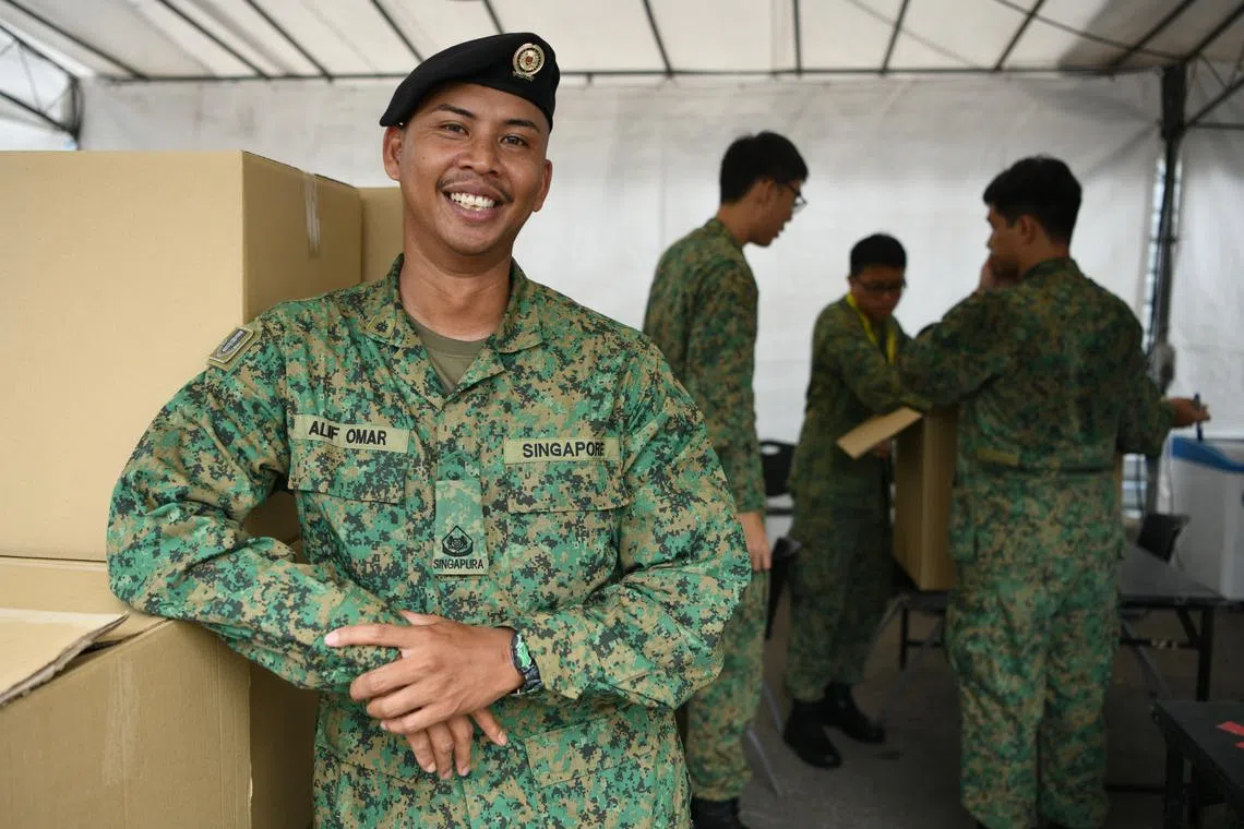 Pegawai Waran Ketiga (3WO) Alif Omar, 40 tahun, dari Batalion ke-30, Jurutera Kombat Singapura, merupakan antara kakitangan yang sentiasa bersedia untuk memenuhi keperluan peserta di balik tabir Perbarisan Hari Kebangsaan (NDP) pada Rabu.