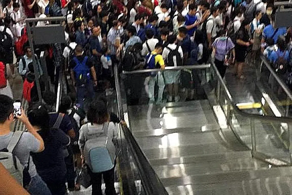 SESAK DI STESEN: Penumpang terpaksa menempuh kesesakan di stesen MRT Punggol pagi semalam dek kerosakan kuasa di laluan North East (NEL). - Foto INTERNET -