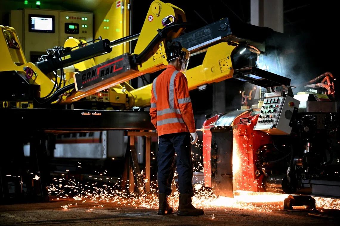 Mesin ‘flash butt’ mencengkam, mengimpal hujung rel untuk siapkan kerja penggantian dalam masa 15 minit