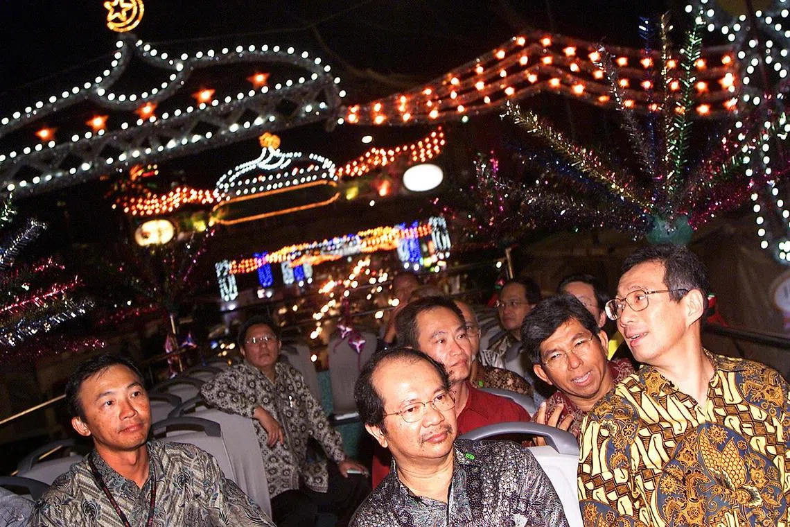 Perdana Menteri, Encik Lee Hsien Loong (kanan), meninjau kawasan Geylang Serai dengan bas terbuka selepas pelancaran rasmi Penyalaan Lampu Hari Raya 2004 – menunjukkan komitmen beliau bersua dan berinteraksi dengan masyarakat Melayu. Duduk di sebelah Encik Lee ialah mantan Presiden Majlis Pusat, Encik Zulkifli Mohammed. Di belakang Encik Lee ialah mantan Menteri Bertanggungjawab Bagi Ehwal Masyarakat Islam, Dr Yaacob Ibrahim. - Foto STREATS