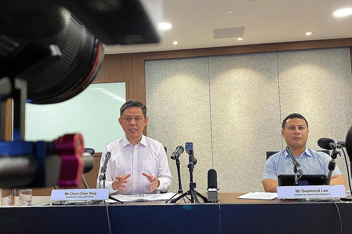 BERI PENJELASAN: Menteri Perdagangan dan Perusahaan Encik Chan Chun Sing (kiri), bersama Menteri Pembangunan Negara, Encik Desmond Lee, hadir semasa sidang media bersama JTC dan NParks bagi menjelaskan isu berkaitan kesilapan dalam menebas tapak tanah Kranji Road dan Kranji Close. - Foto LIANHE ZAOBAO
