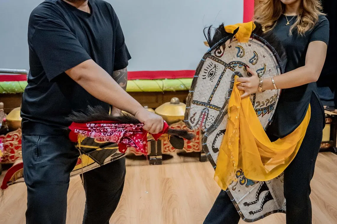 Anggota salah satu kumpulan Kuda Kepang Singapura, Kesenian Tedja Timur, Encik Mohamed Azime Abdullah (kiri) dan Cik Nur Inyirah Zayanah Muhammad Raihan. Wartawan Berita Harian dapat bertemu dengan mereka dan Presiden Persatuan Kuda Kepang Singapura, Encik Iswandiarjo Wismodiarjo, serta salah seorang asatizah untuk mengetahui lebih lanjut tentang kuda kepang. - Foto BM oleh NUR DIYANA TAHA