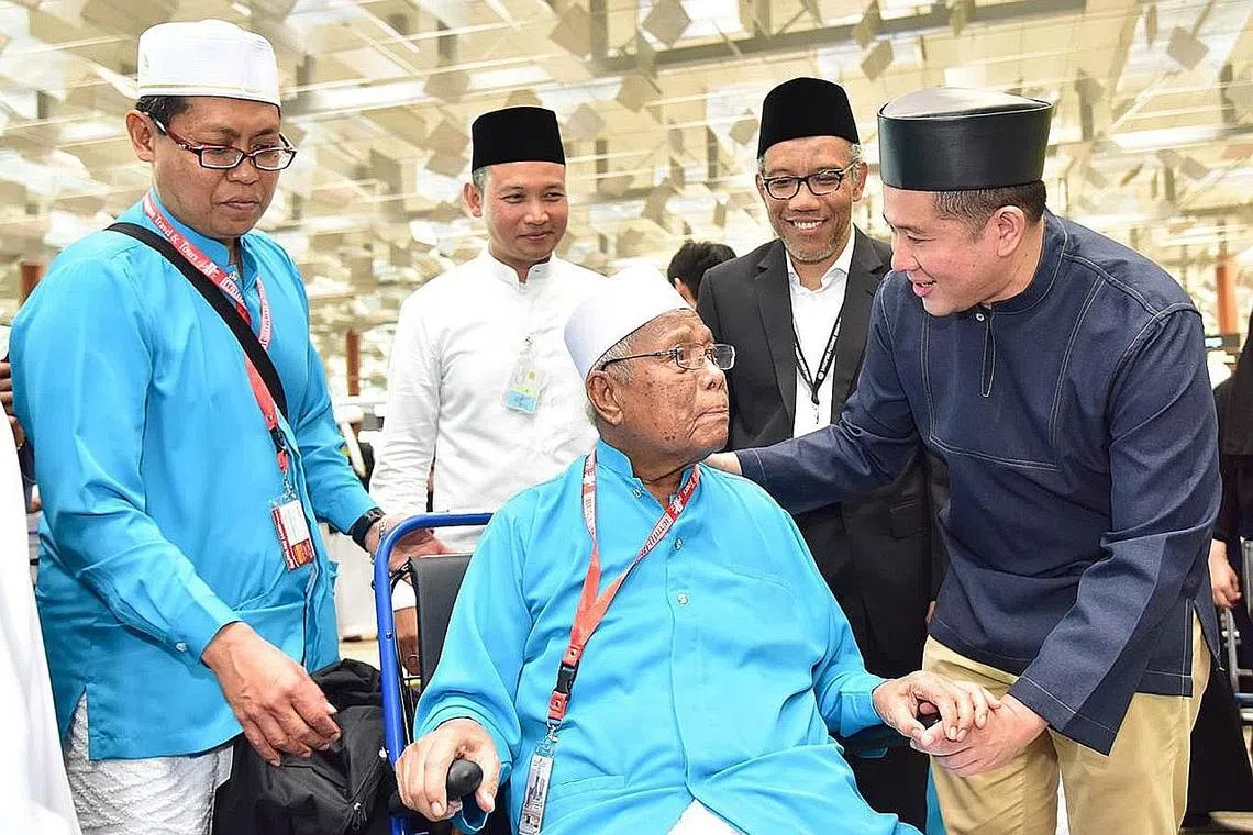 HANTAR JEMAAH: Setiausaha Parlimen Kanan (Ehwal Dalam Negeri merangkap Kesihatan), Encik Amrin Amin (kanan), meluangkan masa berada di Terminal 3 bagi menghantar jemaah Singapura berangkat ke tanah Suci pada Sabtu lalu. Turut hadir ialah Timbalan Ketua Eksekutif Muis Dr Albakri Ahmad (dua dari kanan). - Foto MUIS -